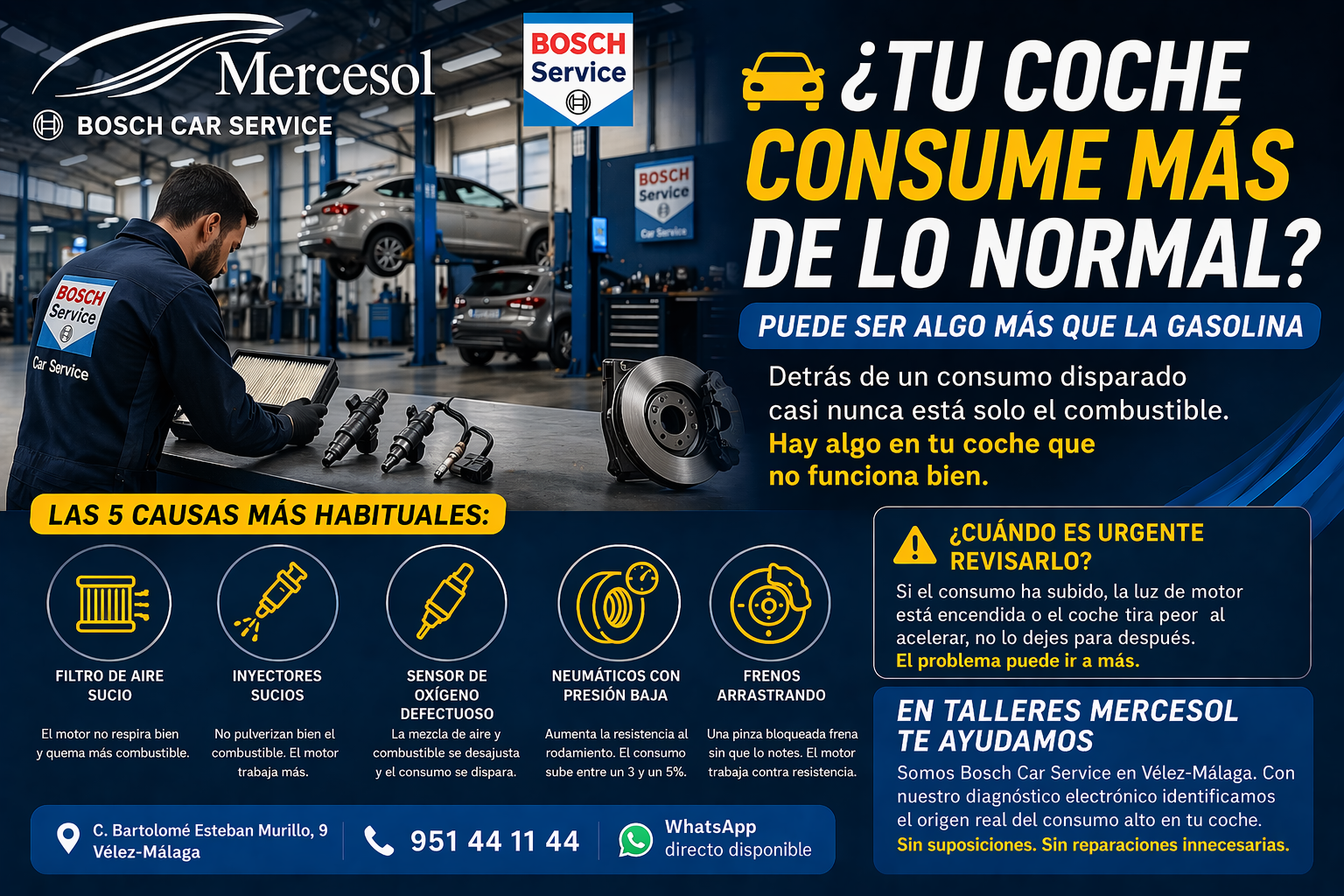 Somos Bosch Car Service en Vélez-Málaga. Con nuestro diagnóstico electrónico identificamos exactamente qué está causando el consumo elevado en tu vehículo — sin suposiciones, sin reparaciones innecesarias.